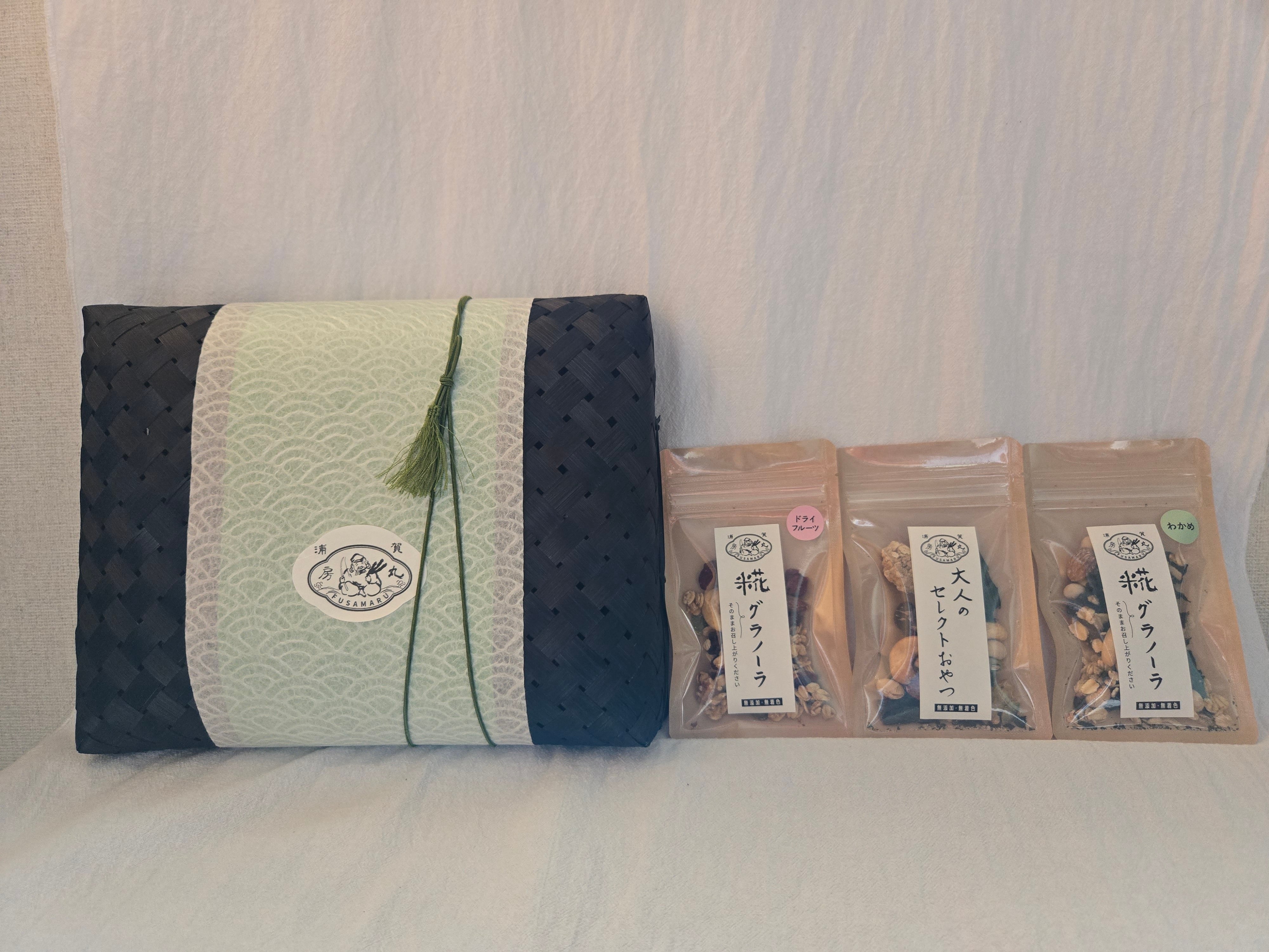 そして人気の糀グラノーラ(わかめ・フルーツ・大人のセレクトおやつ)を詰め合わせました。